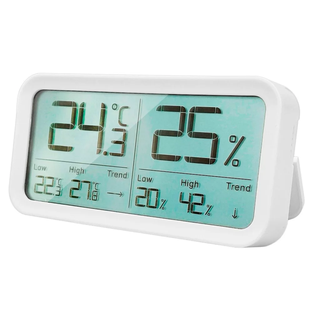- Термогигрометр снабжен большим Ж/К дисплеем высокой контрастности, занимающим всю переднюю панель прибора. Ж/К дисплей имеет угол обзора 160о, обеспечивающий хорошую видимость показаний с любого места.