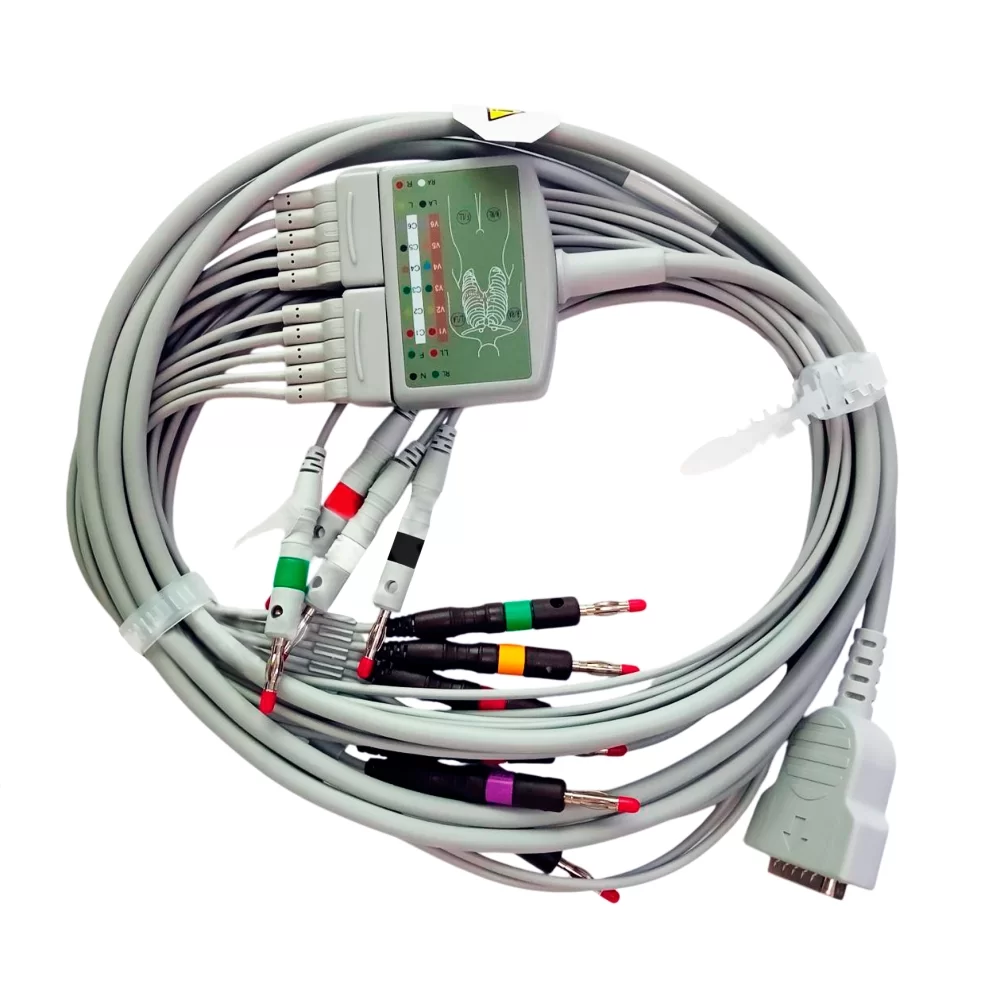 - Конструкция кабеля включает центральный жгут с наконечником, узел стыковки ветвей, отдельные ветви и их наконечники для подключения электродов. В комплект входят 6 отведений для грудных и 4 отведения для конечностных электродов, снабженные цветовыми маркерами для удобного и правильного расположения на теле пациента.