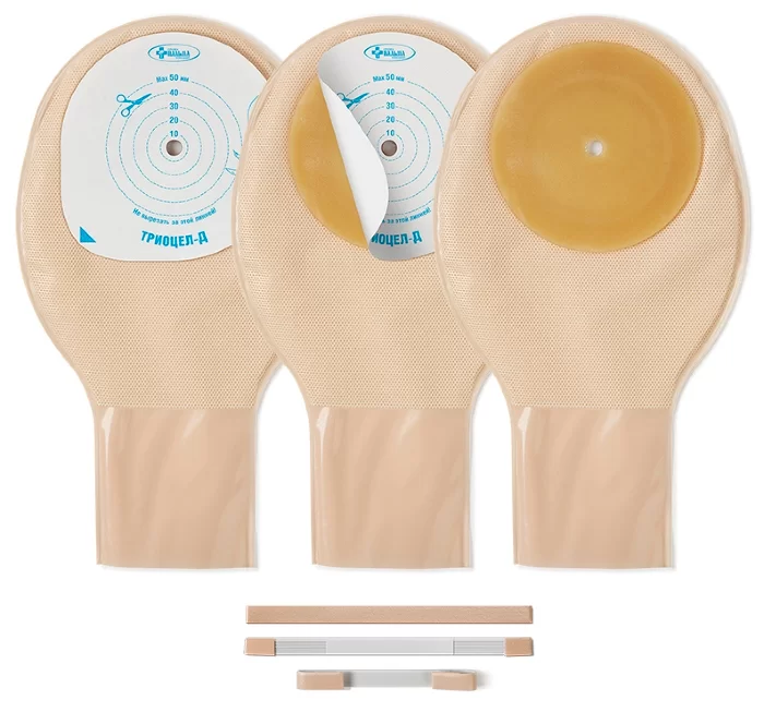 - Однокомпонентные калоприёмники ТРИОЦЕЛ® представляют собой ёмкости, изготовленные из многослойной полимерной запахонепроницаемой плёнки, приклеивающиеся к коже с помощью герметизирующего кольца. Материал плёнки не пропускает запах содержимого ёмкости в течение всего времени использования изделия.