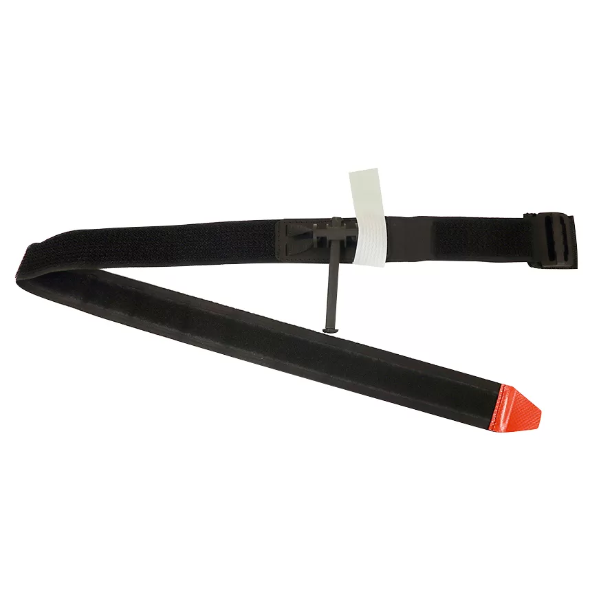 - свободный конец ленты жгута продевается в пряжку и создают петлю для наложения ее на конечности, выполняется затягивание на конечности и фиксация с применением застежки «велькро» (к телу пострадавшего прилегает гладкая лента). Далее с применением рычага затяжного механизма стропы наматываются на оси катушки и далее жгут затягивается до полноценной приостановки кровотечения.