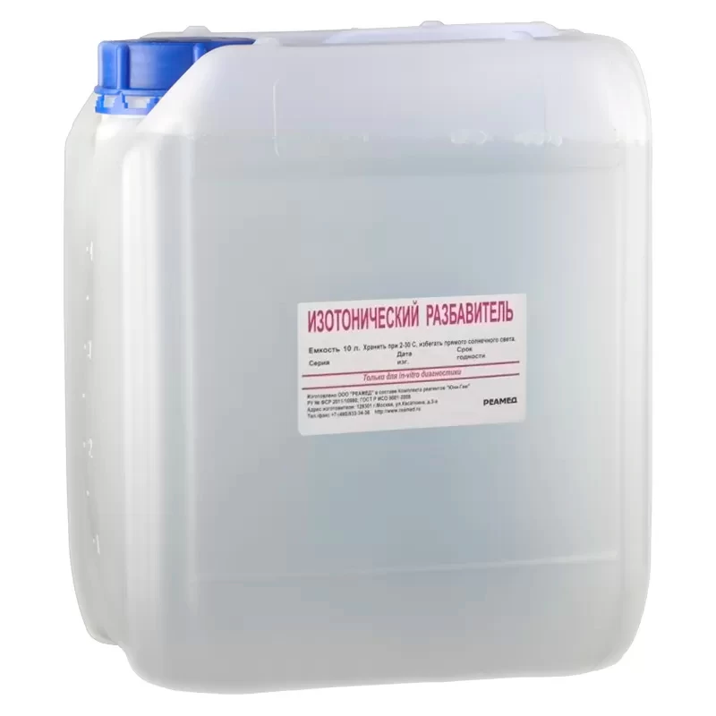 - Изотонический разбавитель предназначен для разведения пробы крови и представляет собой буферный раствор со строго определенными значениями pH, проводимости и осмолярности, что обеспечивает поддержание постоянного объема клеток. Специальные добавки, воздействуя на мембраны клеток, дают возможность дифференцировать лейкоциты на три субпопуляции.
