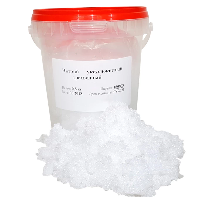 - Натрий уксуснокислый (ацетат натрия) 3-водный — кристаллическое химическое вещество (тригидрат) высокой степени чистоты, хорошо растворимое в воде. Используется в химических, технологических и лабораторных процессах как источник ацетат-иона и натрия, а также как компонент буферных растворов. Упаковка 0,5 кг удобна для лабораторий, небольших производств и регулярного расхода.