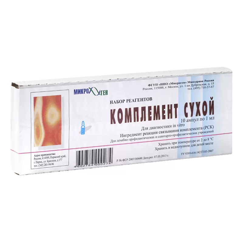 - Перед поставкой РСК комплемент растворяют в 1 мл 0,9 % раствора натрия хлорида. Комплемент растворяется в течение 2 мин. Растворенный комплемент представляет собой опалесцирующую жидкость от светло-желтого до красного цвета с коричневым оттенком без осадка и хлопьев. Хранить растворенный препарат при температуре от 2 до 8 ºС не более 8 ч.