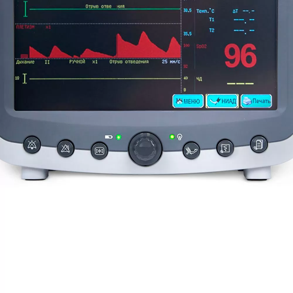 - Монитор позволяет вести контроль за физиологическими кривыми: электрокардиограмма (ЭКГ), неинвазивное кровяное давление (НИАД), инвазивное кровяное давление (IBP), температура тела (Т), частота дыхания (ЧД), пульсоксиметрия (SpO₂) и уровень углекислого газа (СО₂)