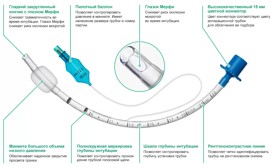 - Полноокружная маркировка глубины интубации облегчает визуальный контроль точного позиционирования трубки в трахее.