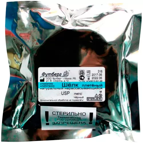 - Стерильный нерассасывающийся шовный материал природного происхождения из Фиброина (белка, вырабатываемого личинками шелковичных червей Bombyx Mori), с покрытием.