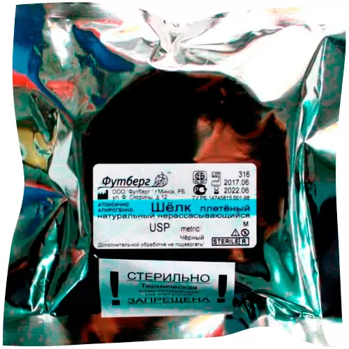 - Стерильный нерассасывающийся шовный материал природного происхождения из Фиброина (белка, вырабатываемого личинками шелковичных червей Bombyx Mori), с покрытием.