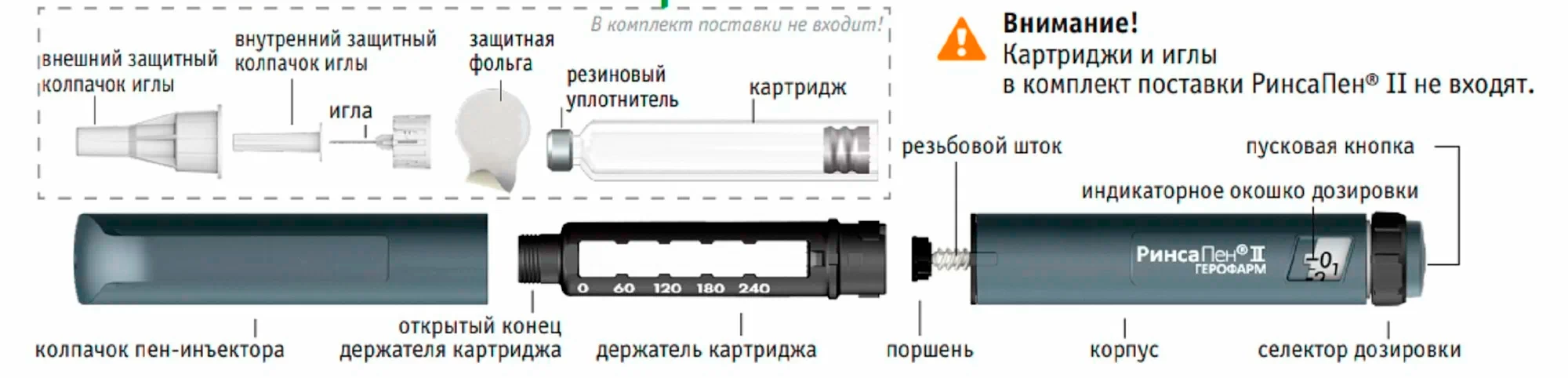 - Многоразовая шприц-ручка РинсаПен II предназначена для введения инсулина объемом от 1-й до 60-ти единиц.
