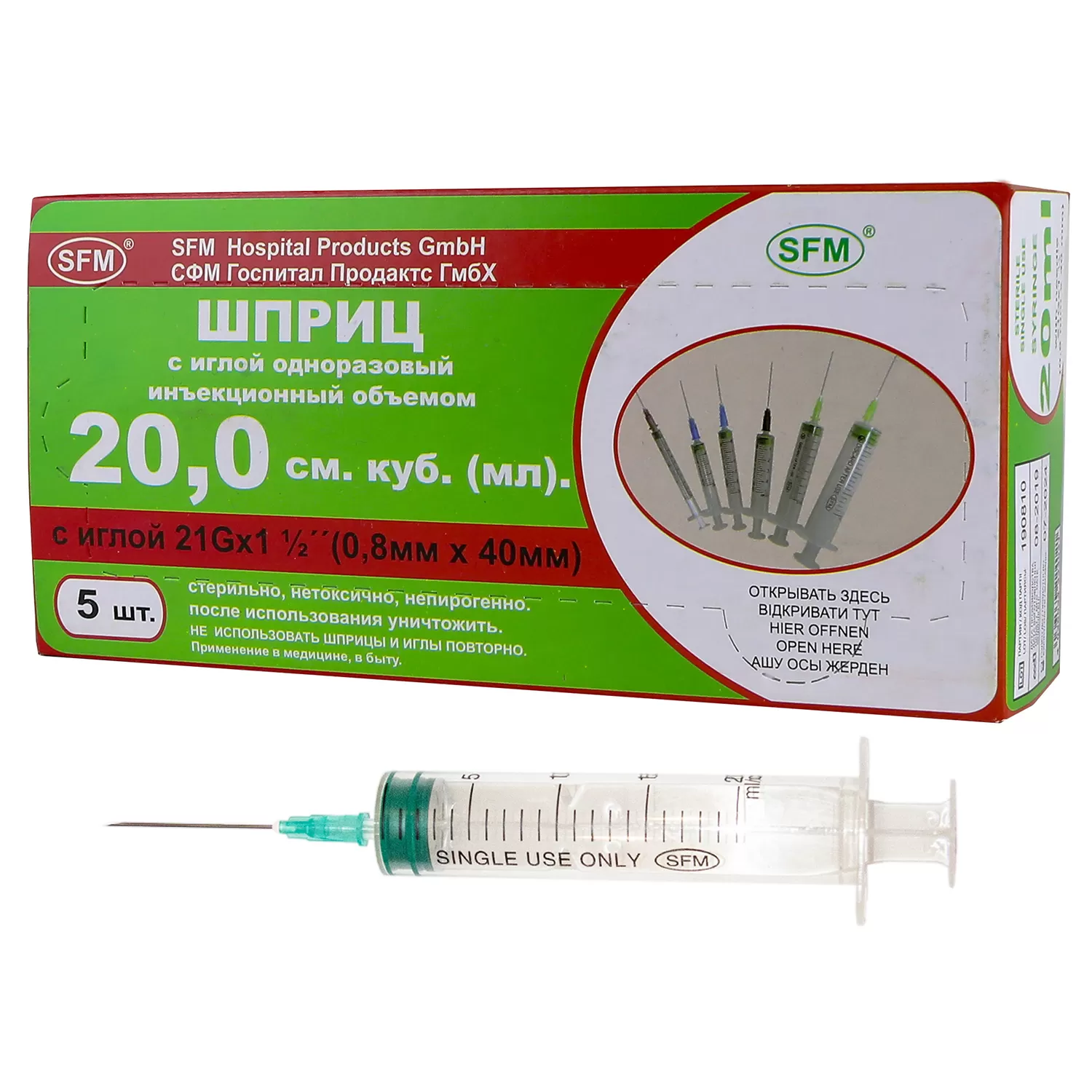 Шприцы трехкомпонентные одноразовые в аптечных упаковках от 2 до 10 мл изготовлены с коаксиальным (по центру) расположением крепления иглы, шприц 20 мл поставляется с креплением сбоку.