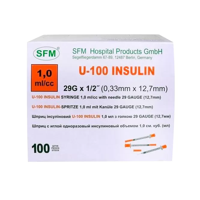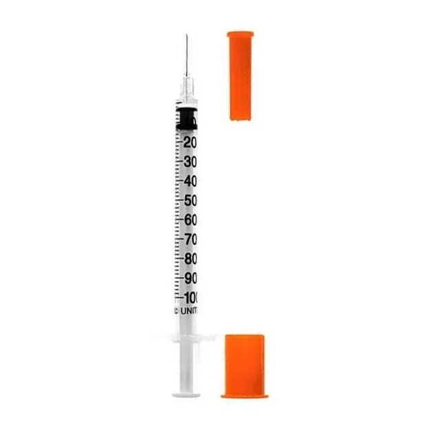 - Шприц инсулиновый U-100 с интегрированной иглой состоит из трех компонентов: цилиндр, поршень и манжета.