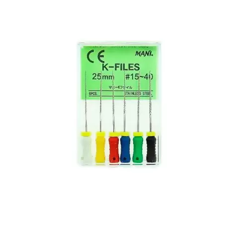 Эндодонтические инструменты K-Files MANI применяются в стоматологии в подготовительных целях перед сложными реставрациями для расширения и коррекции формы корневых каналов.