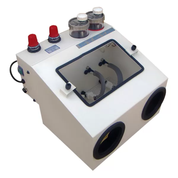 Встроенная подсветка, регулятор давления на каждую емкость струйного средства. Диаметр сопел 0,8 (рекомендовано средство 50-100 мкм) и 1 мм (рекомендовано средство 150-200 мкм), диаметр сопла для рециркуляции 3,5 мм. Необходимо подключение сжатого воздуха, давление 2-4 бар, расход 100-120 л/мин.