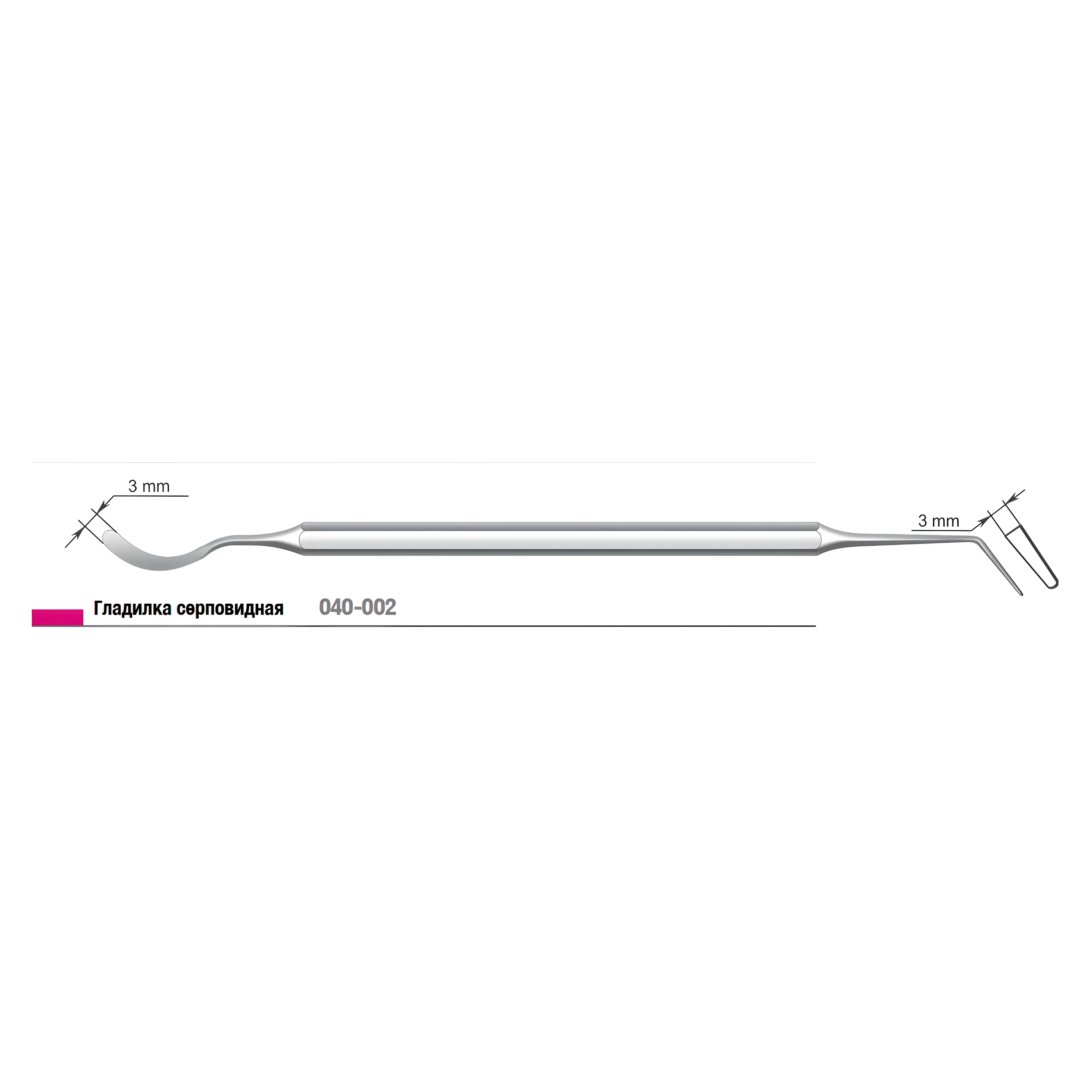 - Первая рабочая часть — серповидная гладилка с максимальной шириной рабочей части — 3,2 мм и минимальной толщиной — 0,5 мм