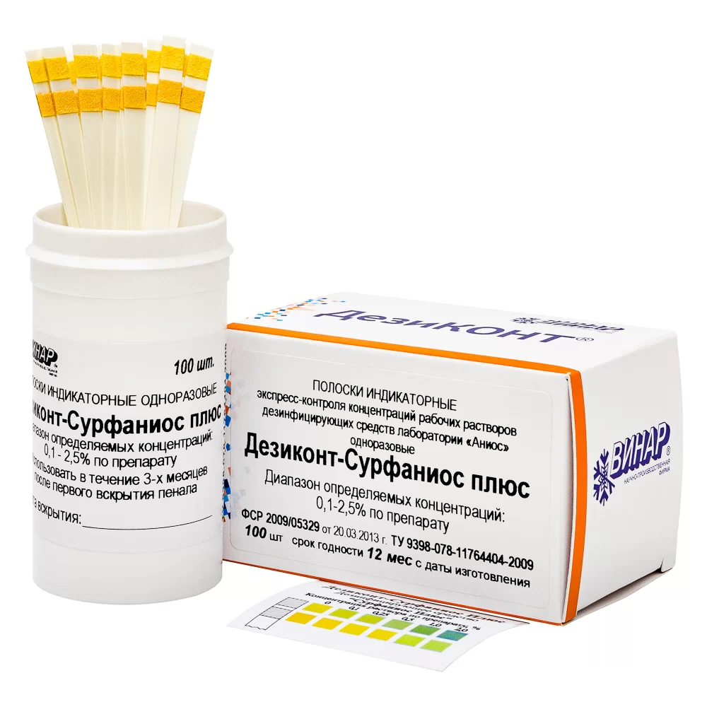 - для оперативного определения концентраций рабочих растворов дезинфицирующих и стерилизующих средств, в данной модификации - Сурфаниос плюс.