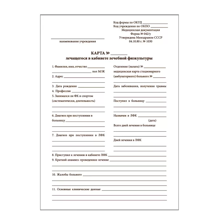 - Карта используется для записи сведений о пациенте, проходящем лечение в кабинете лечебной физкультуры. Все назначенные пациенту процедуры вносятся в бланк. Для каждого пациента заводится один экземпляр. Бланк содержит вкладной лист.