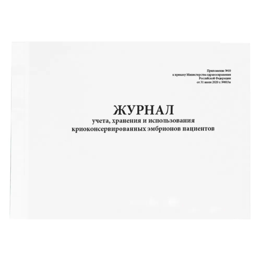 Журнал учета, хранения и использования криоконсервированных эмбрионов пациентов. Приложение № 10. Приказ Министерства здравоохранения РФ от 31 июля 2020 г. № 803н "О порядке использования вспомогательных репродуктивных технологий, противопоказаниях и ограничениях к их применению".
