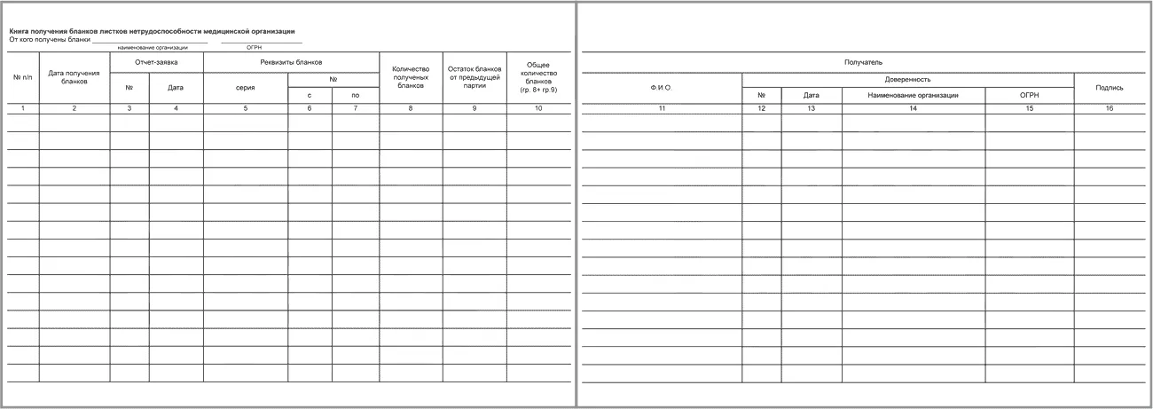 Книге получения бланков листков нетрудоспособности медицинской организации должна быть пронумерована, прошнурована и иметь на последней странице запись: наименование организации, количество страниц, печать организации и подпись руководителя. Записи в книге производятся в хронологическом порядке при совершении операции лицом, ответственным за получение, выдачу и хранение бланков листков нетрудоспособности.