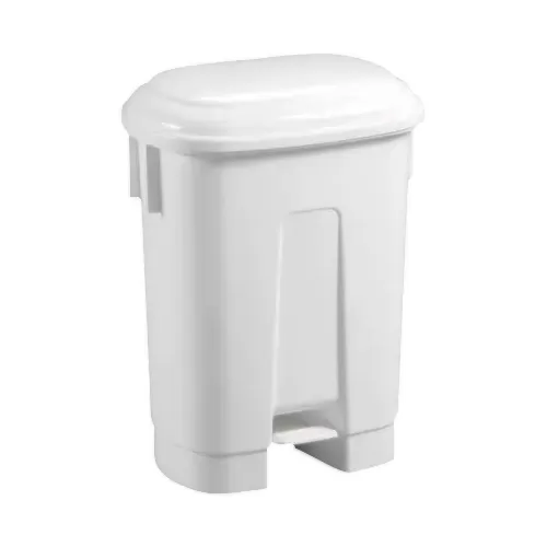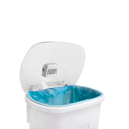 - Ведро оснащено держателем под мешок и педалью, белое с белой крышкой.