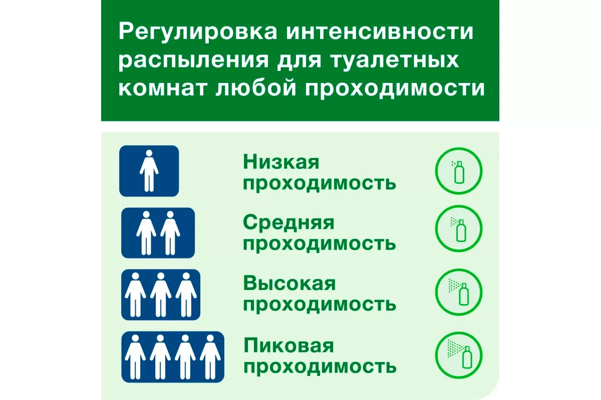 - Благодаря программируемым режимам распыления возможно использование в туалетных комнатах разной площади.