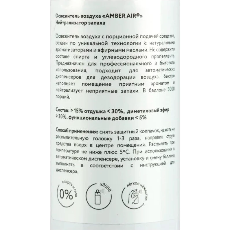 - Эффективно и успешно контролируйте запах в туалетной комнате с аэрозольным освежителем воздуха Amber air с нейтральным ароматом.
