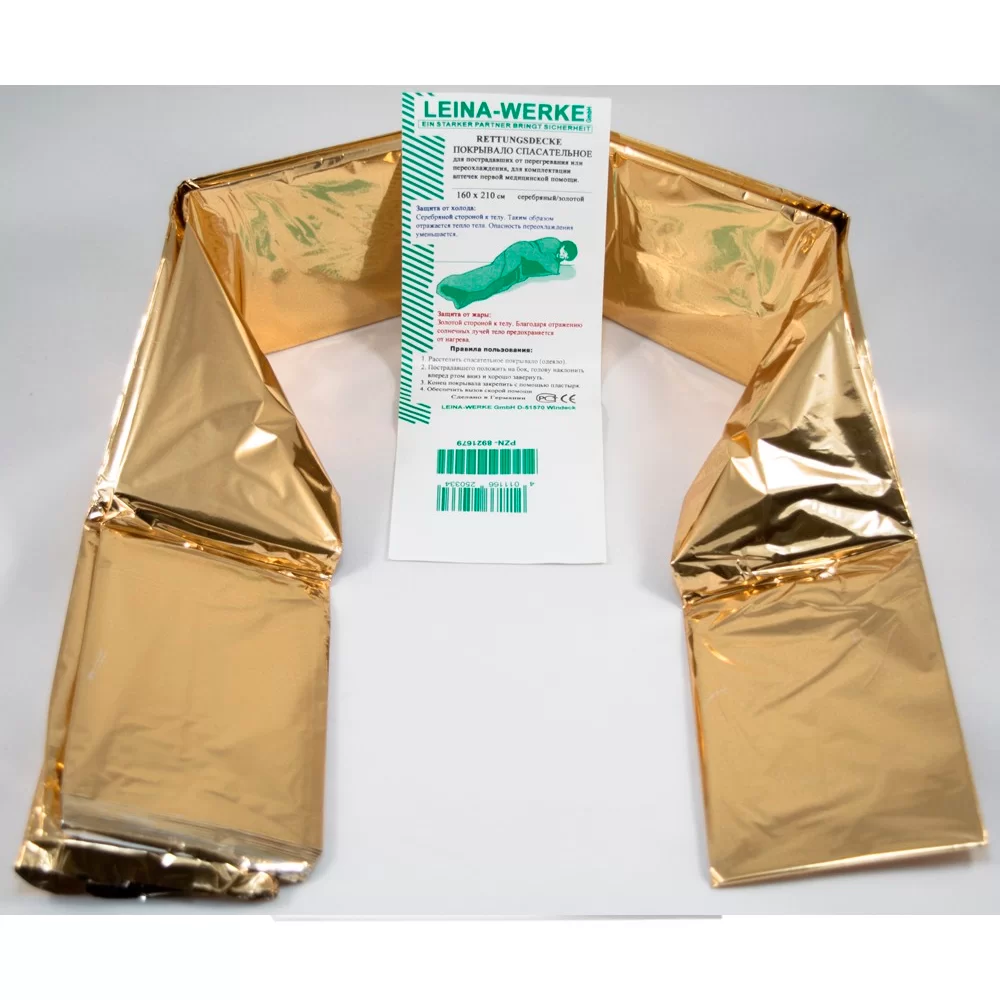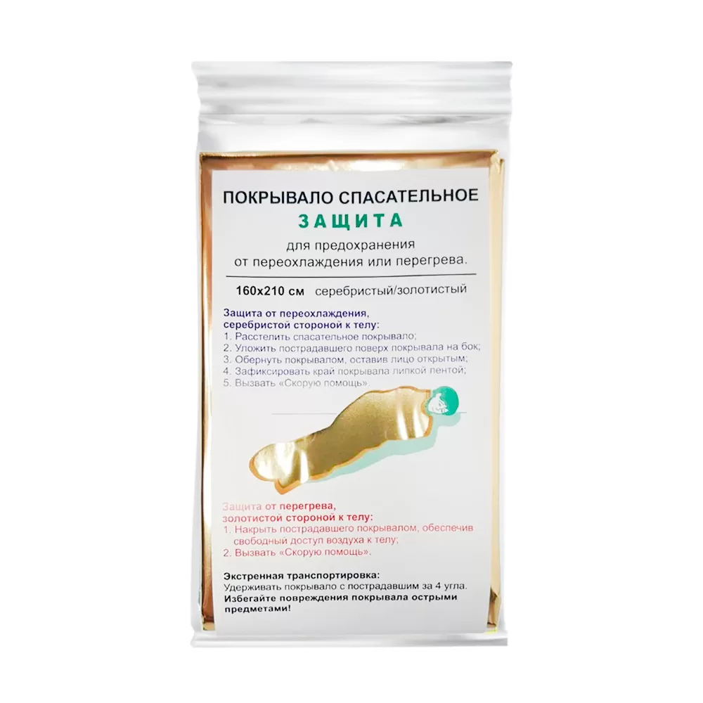 - При несчастном случае покрывало защищает пострадавшего от переохлаждения или перегревания в течение 20 часов, а также предохраняет его от осадков.