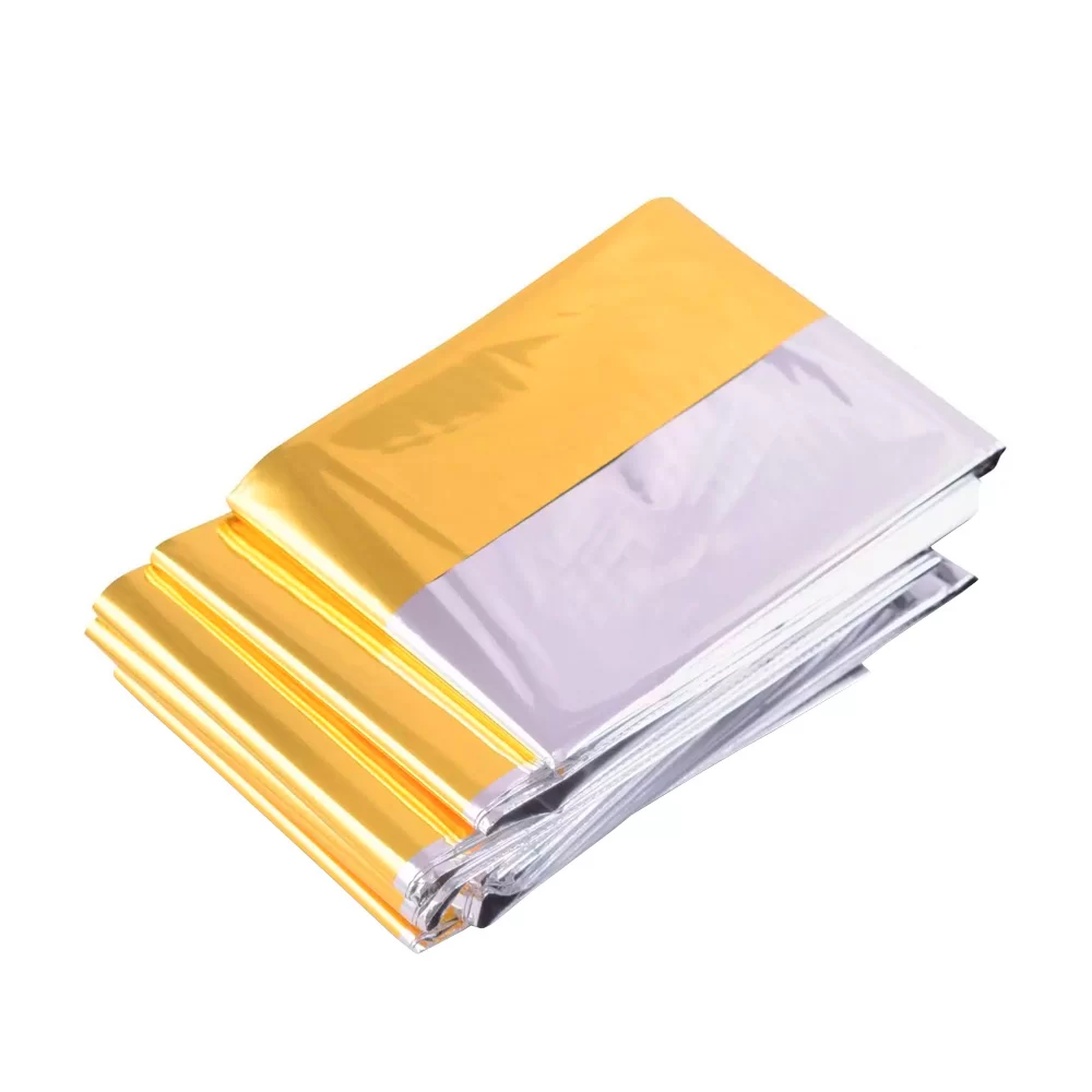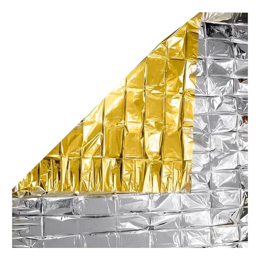 - Покрывало спасательное представляет собой полиэфирную пленку с напылением металла серебристого и золотистого цвета с разных сторон.