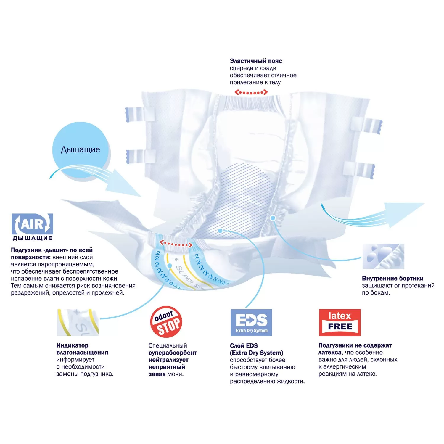 - двойной впитывающий слой с антибактериальным суперабсорбентом — высокая впитываемость и нейтрализация неприятного запаха;