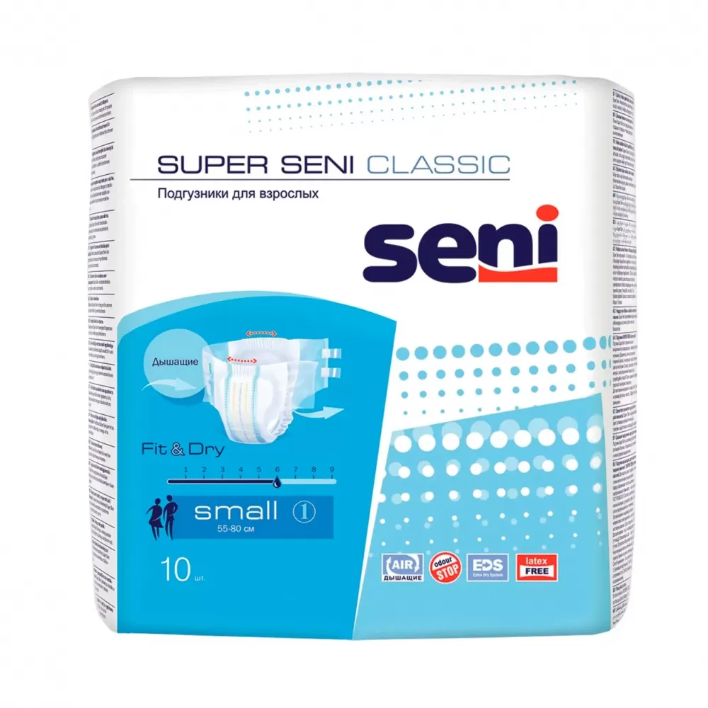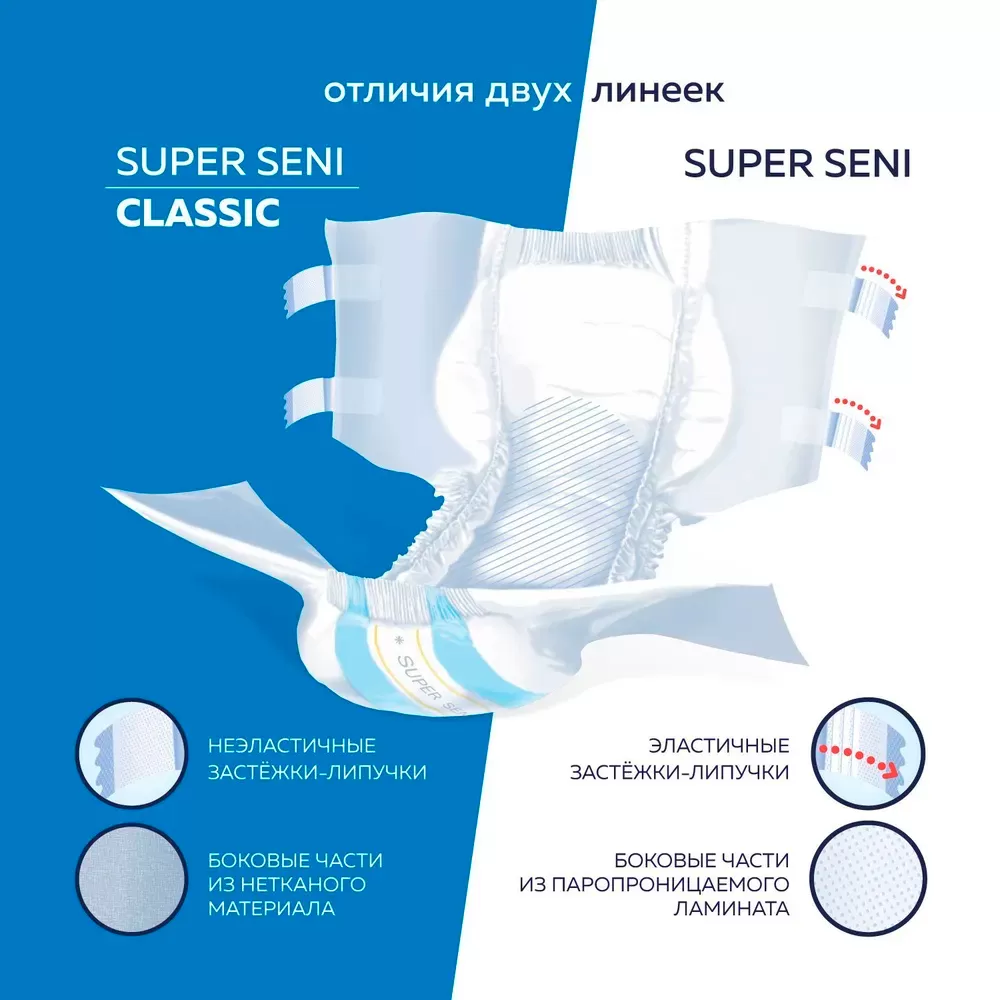 - Super Seni Classic - классические подгузники для взрослых с боковыми крыльями из нетканого материала.