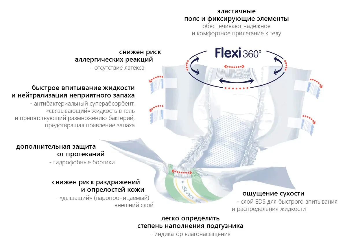- двойной впитывающий слой с суперабсорбентом обеспечивает высокую впитываемость и нейтрализацию неприятного запаха;