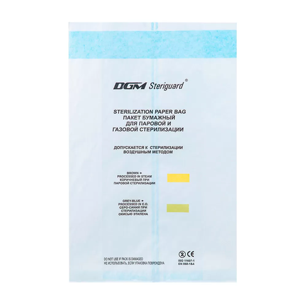 - На пакете нанесены химический индикаторы первого класса, который позволяет отличить простерилизованные изделия от изделий, не подвергнутых стерилизационной обработке.