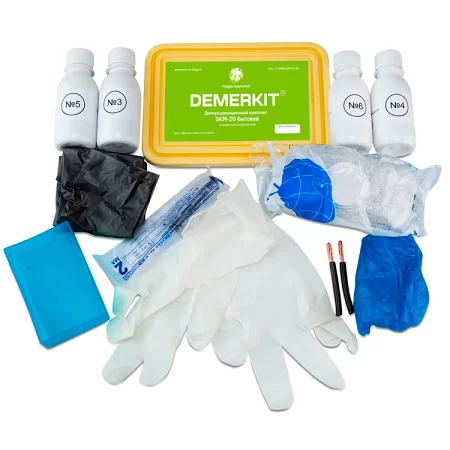 - Высыпать в ёмкость с водой содержимое химического демеркуризатора (емкость №3), затем добавить последовательно туда же раствор из ёмкости №4 и из ёмкости №5, тщательно перемешать. Раствор приобретёт темно-бурый оттенок. Раствор демеркуризатора позволяет удалить с очищенной поверхности и обезвредить невидимые микрокапли ртути и абсорбированные пары ртути. Раствор не разрушает поверхность паркетного покрытия, линолеума, однако при попадании раствора на некоторые виды тканей, обоев и светлого покрытия возможна их частичная окраска. Срок хранения приготовленного раствора 24 часа