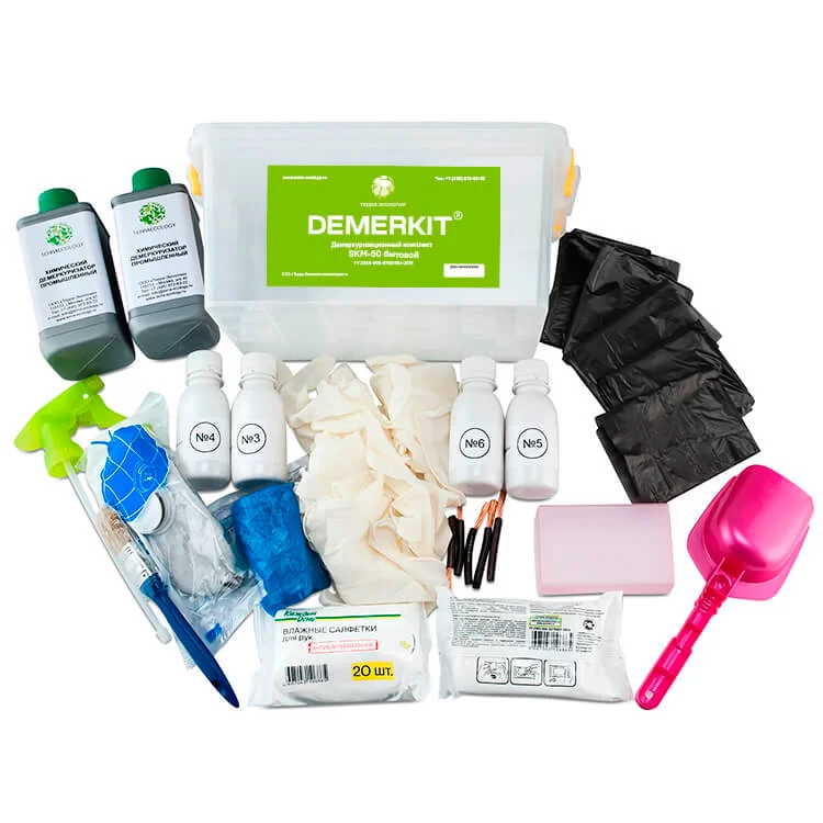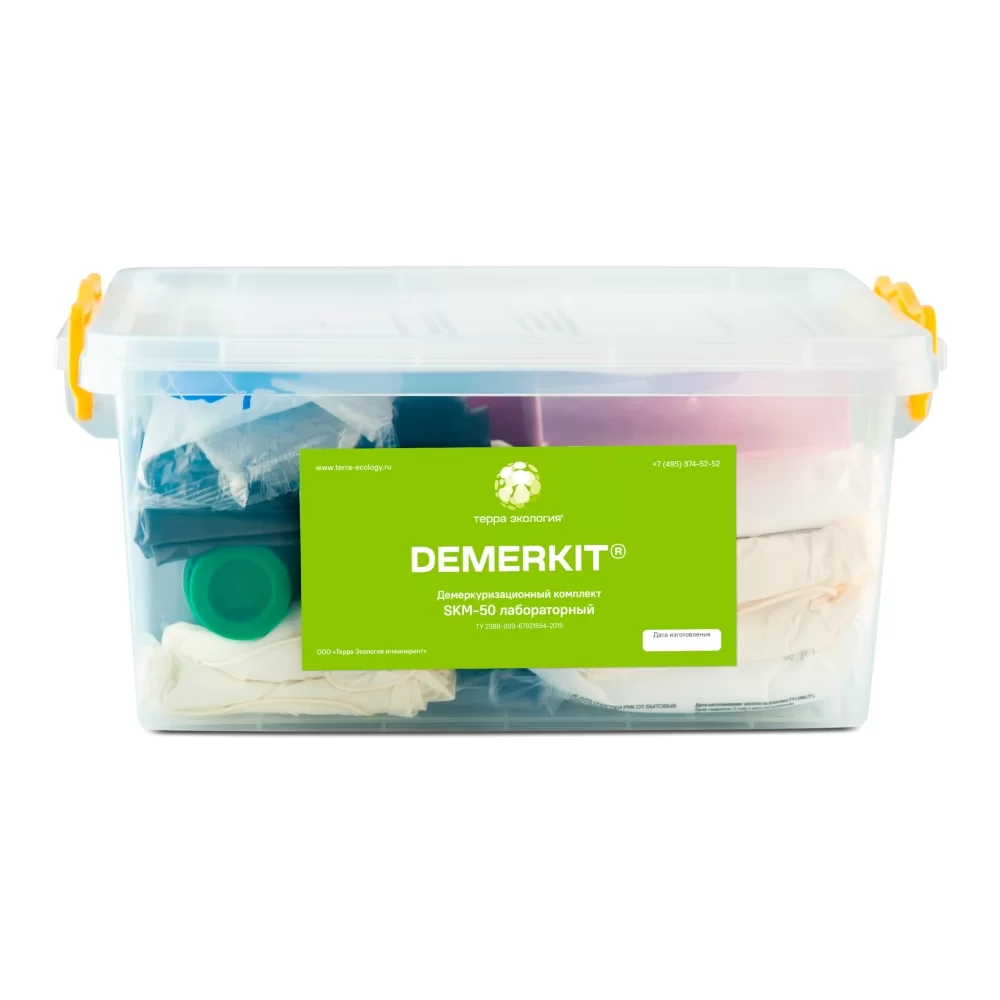 - Демеркуризационный комплект DEMERKIT SKM-50 (лабораторный) является наиболее легким, компактным, удобным, простым средством для быстрого реагирования при сборе проливов и паров ртути в лаборатории и лпу.