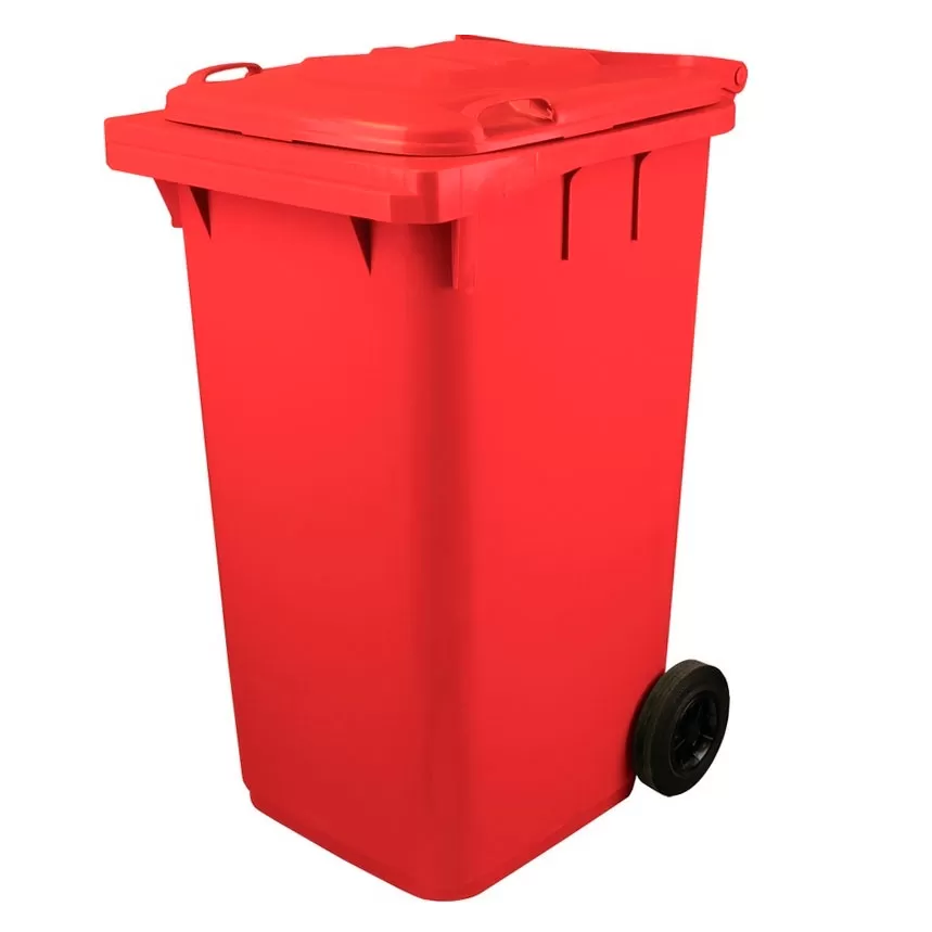 - Контейнер с крышкой и двумя колесами, имеет обтекаемую и расширяющуюся вверх прямоугольную форму.