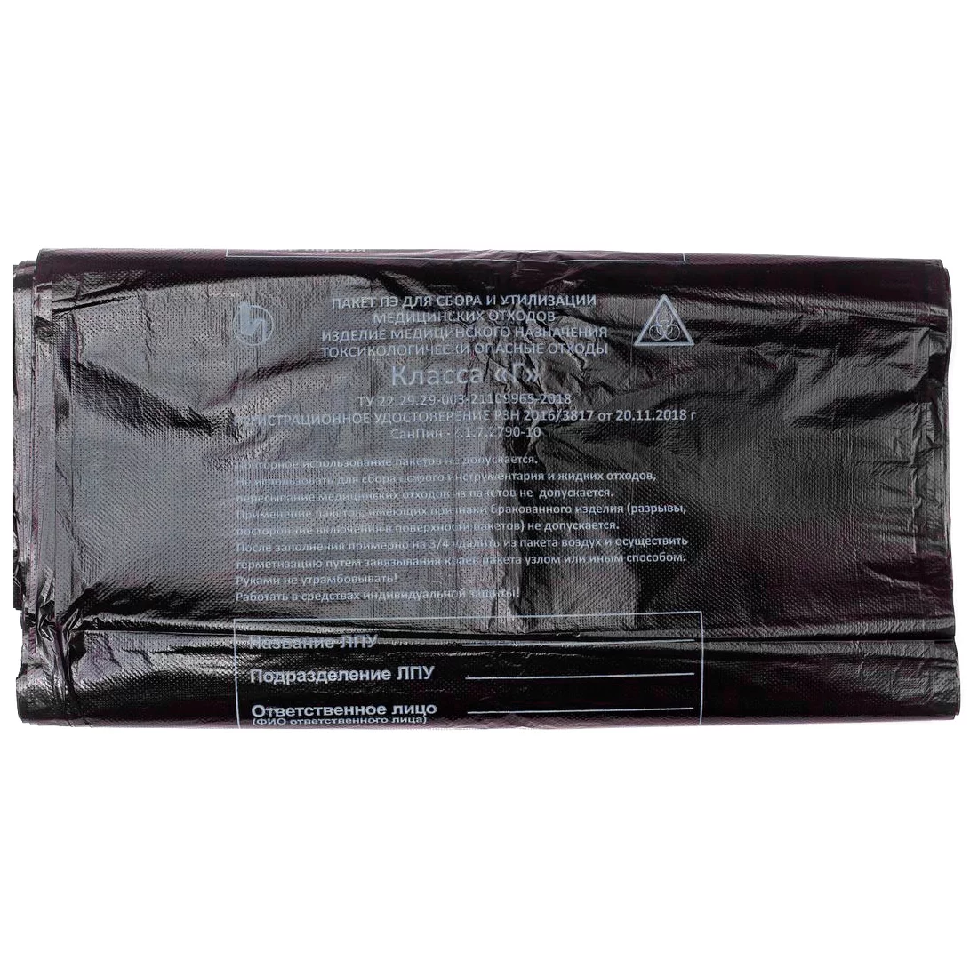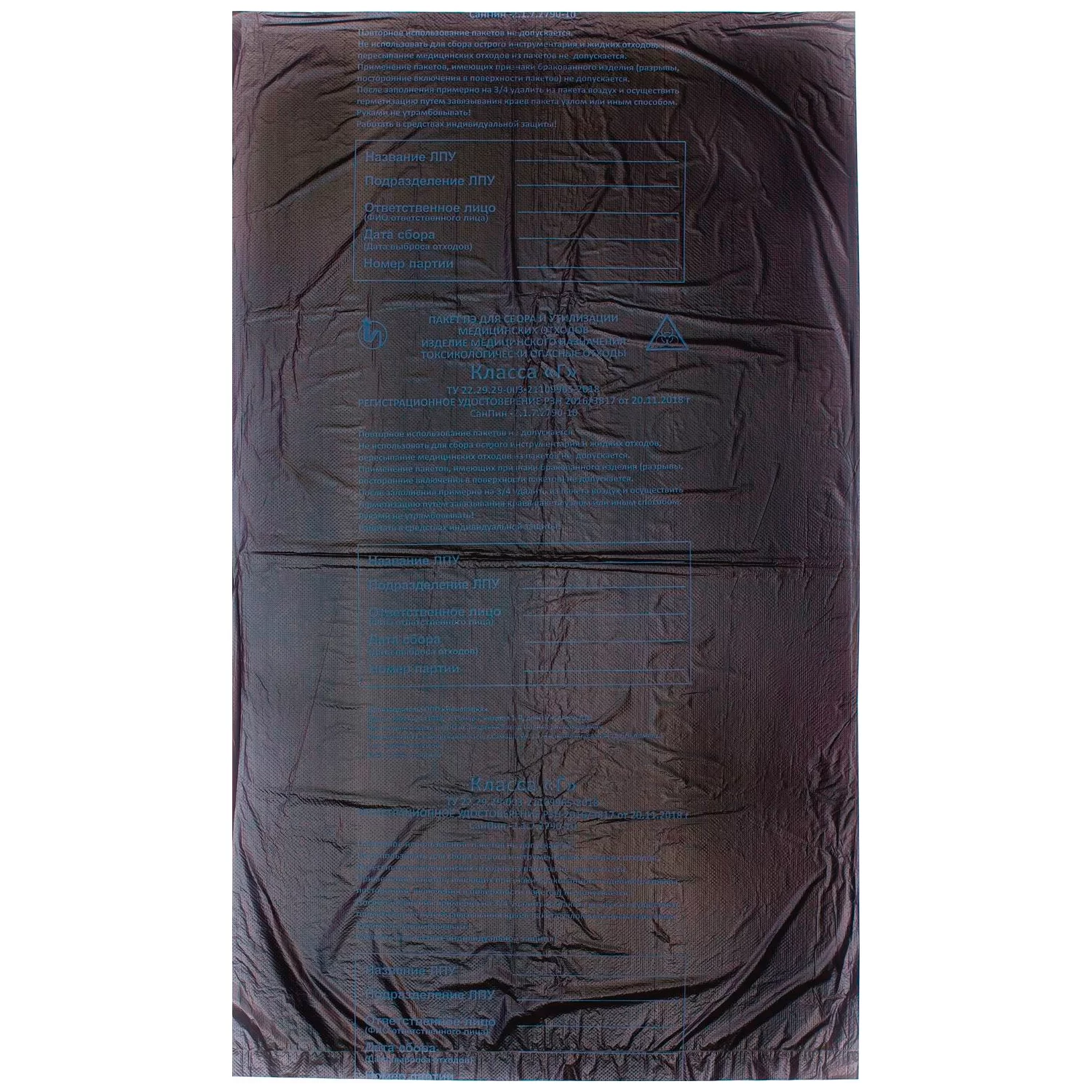 Не используйте пакет повторно и не пересыпайте медицинские отходы из пакета; в пакет нельзя складывать острый инструментарий и сливать жидкие отходы. Не используйте пакеты с разрывами, посторонними включениями в поверхность и другими признаками брака.