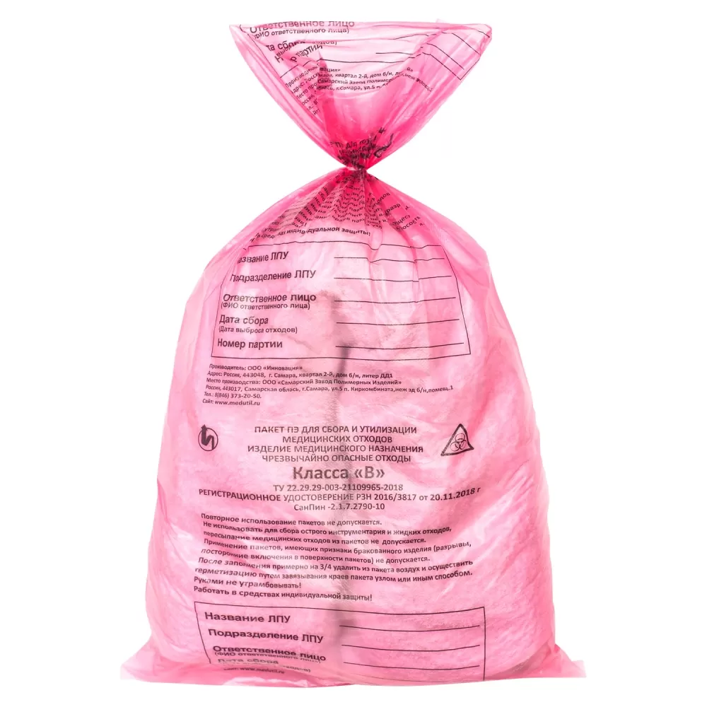 Не используйте пакет повторно и не пересыпайте медицинские отходы из пакета; в пакет нельзя складывать острый инструментарий и сливать жидкие отходы. Не используйте пакеты с разрывами, посторонними включениями в поверхность и другими признаками брака.