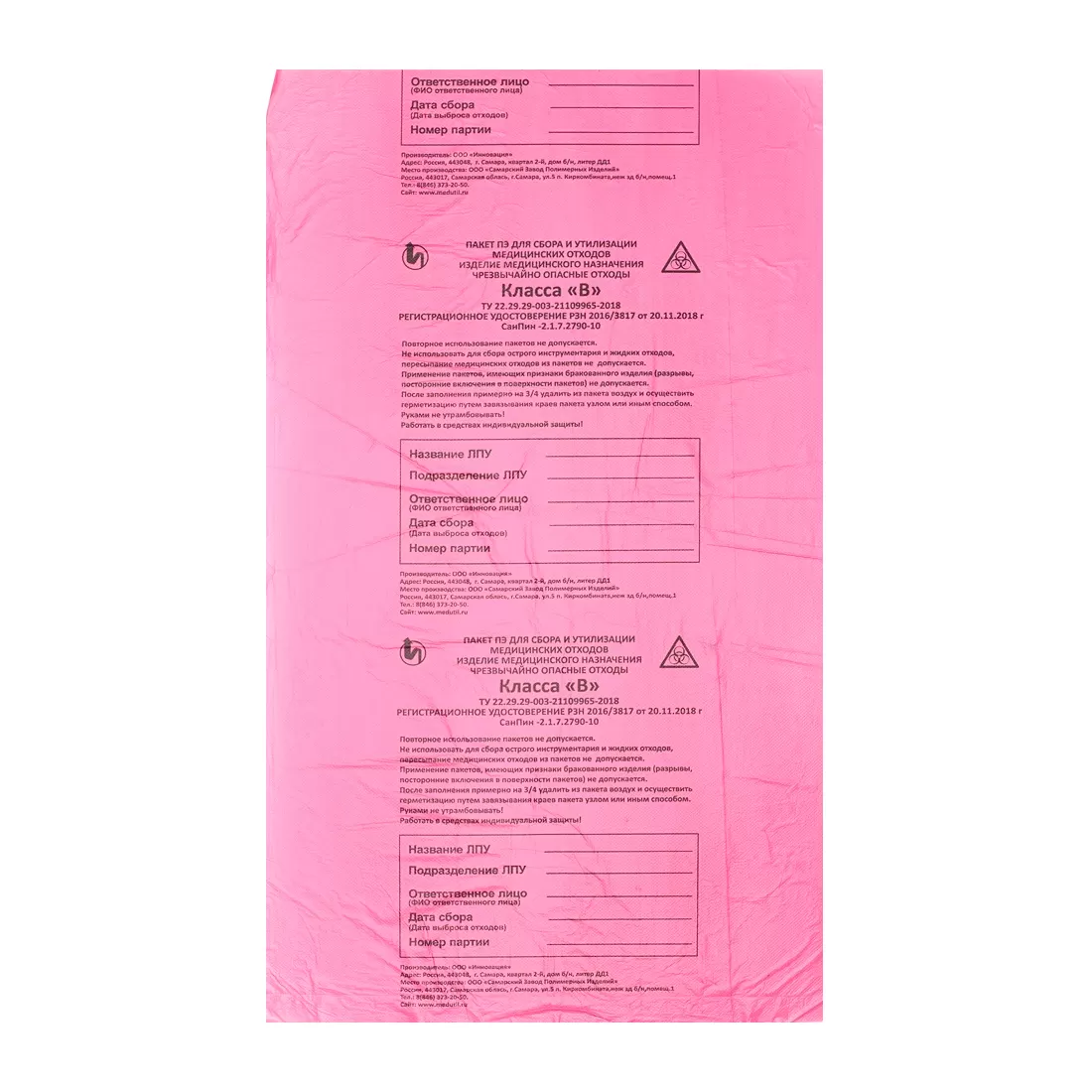 Не используйте пакет повторно и не пересыпайте медицинские отходы из пакета; в пакет нельзя складывать острый инструментарий и сливать жидкие отходы. Не используйте пакеты с разрывами, посторонними включениями в поверхность и другими признаками брака.